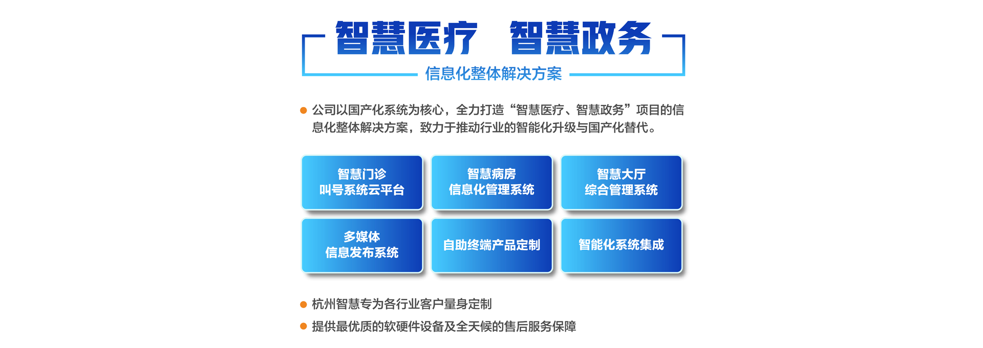 杭州智慧科技有限公司初創(chuàng)于2003年,總部位于重要的電子商務(wù)中心中國(guó)杭州公司主營(yíng)業(yè)務(wù)有:智慧分診叫號(hào)系統(tǒng)、智慧病房醫(yī)護(hù)對(duì)講系統(tǒng)、智慧大廳綜合管理系統(tǒng)、智慧政務(wù)管理系統(tǒng)、智慧多媒體信息發(fā)布系統(tǒng)、導(dǎo)診系統(tǒng)及各自助終端產(chǎn)品定制。專為各行業(yè)客戶量身定制。公司已有20余年行業(yè)經(jīng)驗(yàn)沉淀積累,擁有優(yōu)秀的產(chǎn)品外觀設(shè)計(jì)師和各類中高級(jí)專業(yè)技術(shù)工程師,確保所研發(fā)的產(chǎn)品具有行業(yè)領(lǐng)先的外觀及可靠的技術(shù)性能。并擁有權(quán)威部門頒發(fā)的各類知識(shí)產(chǎn)權(quán)及專利證書,30多項(xiàng)資質(zhì)證書、800多個(gè)合作伙伴、2000多個(gè)項(xiàng)目成功案例經(jīng)驗(yàn)。 智慧產(chǎn)品已遍及全國(guó)各醫(yī)療、政務(wù)、金融、通訊、公安、工商、稅務(wù)等行業(yè),形成以“立足杭州、輻射長(zhǎng)三角、拓展全國(guó)”的戰(zhàn)略發(fā)展格局,產(chǎn)品經(jīng)過(guò)歷年不斷創(chuàng)新,形成專業(yè)化、平臺(tái)化,致力于成為智慧產(chǎn)品的領(lǐng)軍企業(yè)。 公司建立了完善的技術(shù)培訓(xùn)及售后服務(wù)中心,并設(shè)24小時(shí)熱線咨詢電話解答用戶反饋的問(wèn)題。同時(shí)應(yīng)客戶要求定期派技術(shù)人員到 全國(guó)各地進(jìn)行技術(shù)指導(dǎo)輔助用戶正確使用智慧產(chǎn)品并能獨(dú)立安裝、調(diào)試、日常維護(hù)等工作。提供最優(yōu)質(zhì)的設(shè)備及全天候的售后服務(wù)保障,智慧永恒不變的服務(wù)宗旨——致力于客戶的滿意與成功!...
